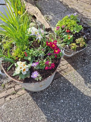 Soms heb je een heel klein stekje van iemand gehad en als je het ergens in je tuin plant dan wordt het misschien overwoekerd door een snelle groeier. Zo had ik nog een wastobbe en een grote kookketel in mijn tuin staan. En elke keer plantte ik een gekregen stek in 1 van die oude zinken teilen. De buitenkant is lelijk,maar er zitten nu zoveel herinneringen in,dat het moeilijk is om die bakken op te ruimen.
