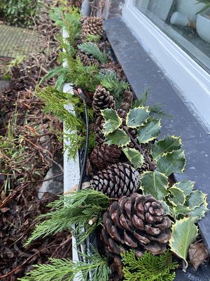 Heb je ook ergens een lege bloembak hangen? Ik had nog wat kerstgroen over van de kerstworkshop en een zakje met denneappels. Deze heb ik neergelegd in de lege bloembak onder het keukenraam, het groen heb ik er hier en daar tussen gestoken. Als je naar buiten kijkt staat dat een stuk gezelliger. Vooral van de bonte hulstblaadjes word je vrolijk als het een sombere dag is!