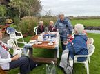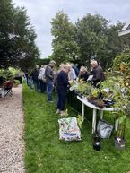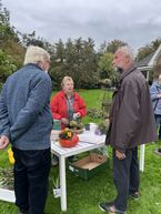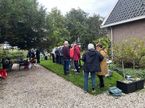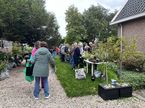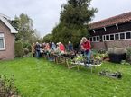 Het weer was somber maar droog! De gastvrouw en gastheer hadden al tafels klaargezet en zelf stekken verzorgd. Ook waren er twee behulpzame buurvrouwen die voor de koffie en thee zorgden. Fantastisch! Het enige dat we nog hoefden te doen was al onze planten per soort neerzetten en eventueel nog labelen. Ook alle stekken die we samen met onze hulp en toeverlaat Han Tuinman hadden opgepot, vanuit zijn grote tuin, stonden erbij. Tijdens de markt kwam er nieuwe voorraad van bezoekers, die dan weer zelf iets gratis konden uitzoeken. Nadat we de spandoeken en vlag hadden opgehangen kwam de eerste bezoekers al kijken. Dit bleef zo tijdens de hele markt. Zelfs tijdens het opruimen kwamen er nog mensen langs om te zien of zij nog iets bijzonders konden vinden.